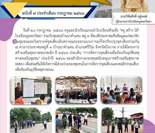 วันที่ 20 กรกฎาคม 2566 ครูและนักเรียนแกนนำโรงเรียนหัวแข็ง “ครู สร้าง ได้” โรงเรียนภูทอกวิทยา ร่วมกับชุมชนบ้านนาคำแคน หมู่ 3 จัดเวทีประชาคมคืนข้อมูลแก่สมาชิกในชุมชนและวิเคราะห์จุดเสี่ยงอันตรายและออกแบบการแก้ไขปรับปรุงจุดเสี่ยงร่วมกัน ณ ศาลาประชาคมหมู่ที่ 3 บ้านนาคำแคน อำเภอศรีวิไล จังหวัดบึงกาฬ ภายใต้โครงการสร้างเสริมสุขภาพขนาดเล็ก ปี 2566 ประเด็น “การจัดการจุดเสี่ยงเพื่อป้องกันอุบัติเหตุทางถนนในชุมชน” ประจำปี 2566 ของสำนักงานกองทุนสนับสนุนการสร้างเสริมสุขภาพ (สสส.) เพื่อส่งเสริมให้เกิดการมีส่วนร่วมของชุมชนในการจัดการจุดเสี่ยงและพฤติกรรมเสี่ยง เพื่อป้องกันอุบัติเหตุทางถนน