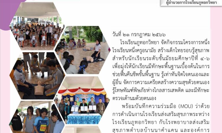 วันที่ 21 กรกฎาคม 2566 โรงเรียนภูทอกวิทยา จัดกิจกรรมโครงการหนึ่งโรงเรียนหนึ่งครูอนามัย สร้างเด็กไทยรอบรู้สุขภาพ สำหรับนักเรียนระดับชั้นมัธยมศึกษาปีที่ 4-6 เพื่อมุ่งให้นักเรียนมีทักษะพื้นฐานเบื้องต้นในการช่วยฟื้นคืนชีพขั้นพื้นฐาน รู้เท่าทันจิตใจตนเองและผู้อื่น จัดการความเครียดสร้างความสุขด้วยตนเอง รู้โทษทัณฑ์พิษภัยห่างไกลสารเสพติด และมีทักษะตรวจเต้านมด้วยตนเอง พร้อมบันทึกความร่วมมือ (MOU) ว่าด้วยการดำเนินงานโรงเรียนส่งเสริมสุขภาพระหว่าง โรงเรียนภูทอกวิทยา กับโรงพยาบาลส่งเสริมสุขภาพตำบลบ้านนาคำแคน และองค์การบริหารส่วนตำบลนาแสง