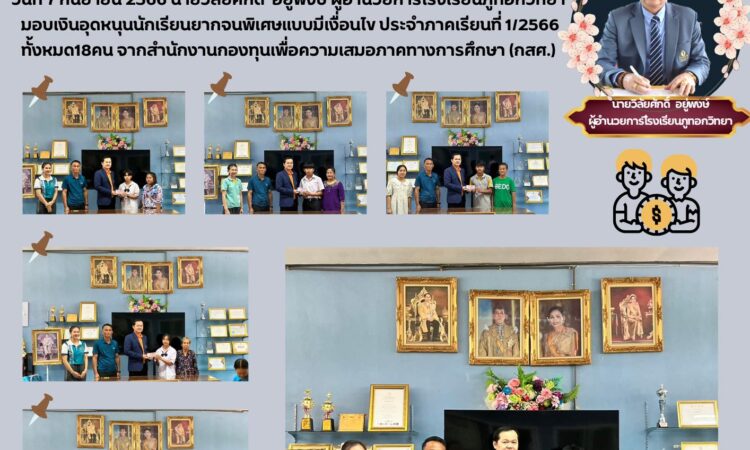 จดหมายข่าว ฉบับที่ 1 ประจำเดือน กันยายน 2566 7 กันยายน 2023 ptw จดหมายข่าวโรงเรียน วันที่ 7 กันยายน 2566 นายวิลัยศักดิ์ อยู่พงษ์ ผู้อำนวยการโรงเรียนภูทอกวิทยา มอบเงินอุดหนุนนักเรียนยากจนพิเศษแบบมีเงื่อนไข ประจำภาคเรียนที่ 1/2566 ทั้งหมด 18 คน จากสำนักงานกองทุนเพื่อความเสมอภาคทางการศึกษา (กสศ.)