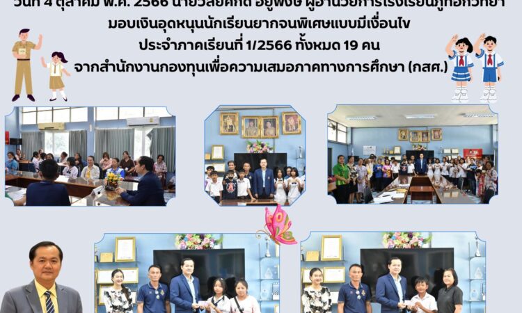 จดหมายข่าว ฉบับที่ 1 ประจำเดือน ตุลาคม 2566 6 ตุลาคม 2023 ptw จดหมายข่าวโรงเรียน วันที่ 4 ตุลาคม พ.ศ. 2566 นายวิลัยศักดิ์ อยู่พงษ์ ผู้อำนวยการโรงเรียนภูทอกวิทยา ได้มอบเงินอุดหนุนนักเรียนยากจนพิเศษแบบมีเงื่อนไข ประจำภาคเรียนที่ 1/2566 ทั้งหมด 19 คน จากสำนักงานกองทุนเพื่อความเสมอภาคทางการศึกษา (กสศ.)