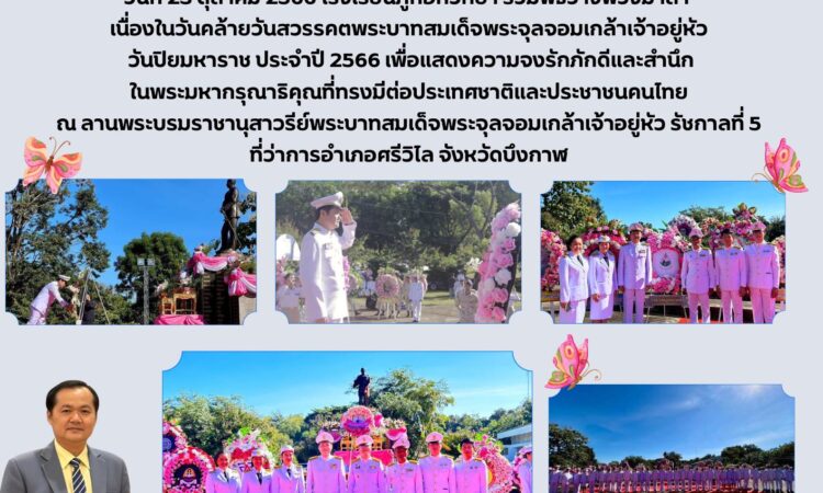 วันที่ 23 ตุลาคม 2566 โรงเรียนภูทอกวิทยา ร่วมพิธีวางพวงมาลา เนื่องในวันคล้ายวันสวรรคตพระบาทสมเด็จพระจุลจอมเกล้าเจ้าอยู่หัว วันปิยมหาราช ประจำปี 2566 เพื่อแสดงความจงรักภักดีและสำนึกในพระมหากรุณาธิคุณที่ทรงมีต่อประเทศชาติและประชาชนคนไทย ณ ลานพระบรมราชานุสาวรีย์พระบาทสมเด็จพระจุลจอมเกล้าเจ้าอยู่หัว รัชกาลที่ 5 ที่ว่าการอำเภอศรีวิไล จังหวัดบึงกาฬ