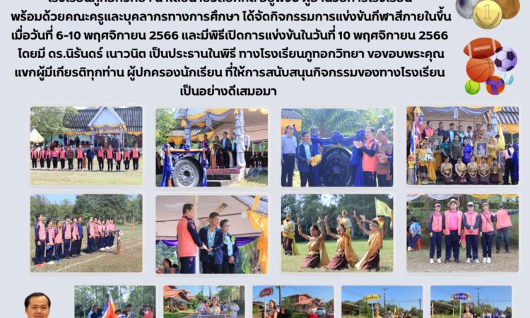 ได้จัดกิจกรรมการแข่งขันกีฬาสีภายในขึ้น เมื่อวันที่ 6-10 พฤศจิกายน 2566 และมีพิธีเปิดการแข่งขันในวันที่ 10 พฤศจิกายน 2566 โดยมี ดร.นิรันดร์ เนาวนิต เป็นประธานในพิธี ทางโรงเรียนภูทอกวิทยา ขอขอบพระคุณแขกผู้มีเกียรติทุกท่าน ผู้ปกครองนักเรียนที่ให้การสนับสนุนกิจกรรมของทางโรงเรียนเป็นอย่างดีเสมอมา