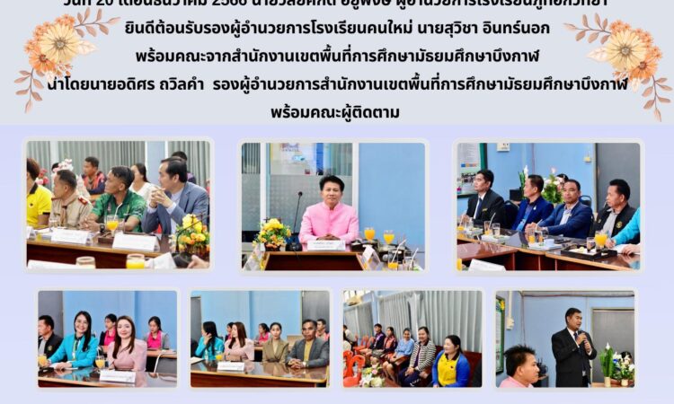 วันที่ 20 เดือนธันวาคม 2566 นายวิลัยศักดิ์ อยู่พงษ์ ผู้อำนวยการโรงเรียนภูทอกวิทยา ยินดีต้อนรับรองผู้อำนวยการโรงเรียนภูทอกวิทยาคนใหม่ นายสุวิชา อินทร์นอก พร้อมคณะจากสำนักงานเขตพื้นที่การศึกษามัธยมศึกษาบึงกาฬ นำโดยนายอดิศร ถวิลคำ รองผู้อำนวยการสำนักงานเขตพื้นที่การศึกษามัธยมศึกษาบึงกาฬ พร้อมคณะผู้ติดตาม