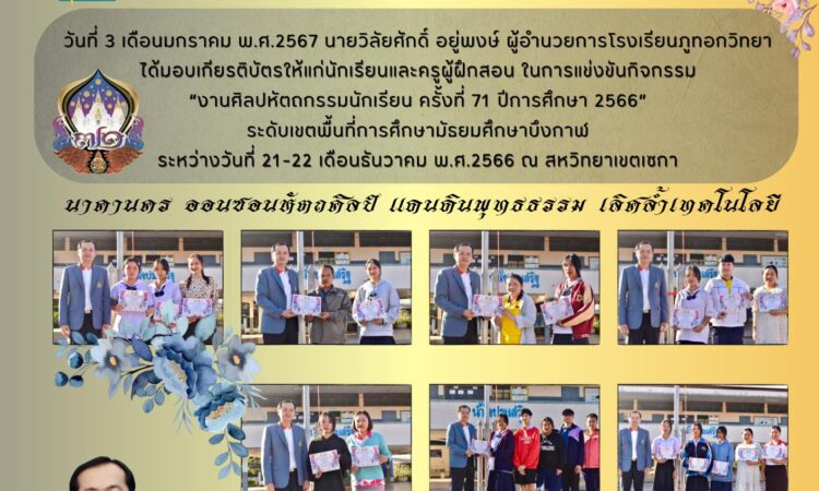 วันที่ 3 เดือนมกราคม พ.ศ.2567 นายวิลัยศักดิ์ อยู่พงษ์ ผู้อำนวยการโรงเรียนภูทอกวิทยา ได้มอบเกียรติบัตรให้แก่นักเรียนและครูผู้ฝึกสอน ในการแข่งขันกิจกรรม “งานศิลปหัตถกรรมนักเรียน ครั้งที่ 71 ปีการศึกษา 2566” ระดับเขตพื้นที่การศึกษามัธยมศึกษาบึงกาฬ ระหว่างวันที่ 21-22 เดือนธันวาคม พ.ศ.2566 ณ สหวิทยาเขตเซกา