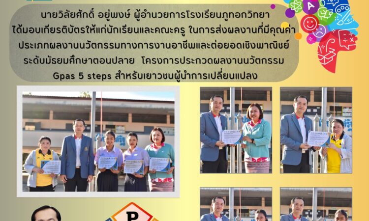 นายวิลัยศักดิ์ อยู่พงษ์ ผู้อำนวยการโรงเรียนภูทอกวิทยา ได้มอบเกียรติบัตรให้แก่นักเรียนและคณะครู ในการส่งผลงานที่มีคุณค่า ประเภทผลงานนวัตกรรมทางการงานอาชีพและต่อยอดเชิงพาณิชย์ ระดับมัธยมศึกษาตอนปลาย โครงการประกวดผลงานนวัตกรรม Gpas 5 steps สำหรับเยาวชนผู้นำการเปลี่ยนแปลง