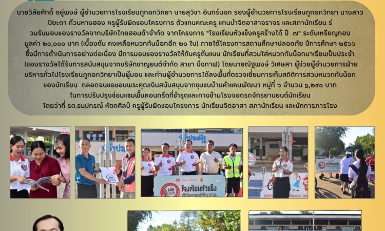นายวิลัยศักดิ์ อยู่พงษ์ ผู้อำนวยการโรงเรียนภูทอกวิทยา นายสุวิชา อินทร์นอก รองผู้อำนวยการโรงเรียนภูทอกวิทยา นางสาวปิยะดา ก้วนหางฮอง ครูผู้รับผิดชอบโครงการ ตัวแทนคณะครู แกนนำจิตอาสาจราจร และสภานักเรียน ร่วมรับมอบของรางวัลจากบริษัทไทยฮอนด้าจำกัด จากโครงการ “โรงเรียนหัวแข็งครูสร้างได้ ปี 7” ระดับเหรียญทอง มูลค่า 20,000 บาท (เบื้องต้น คงเหลือหมวกกันน็อกอีก 20 ใบ) ภายใต้โครงการสถานศึกษาปลอดภัย ปีการศึกษา 2566 ซึ่งมีการดำเนินการอย่างต่อเนื่อง มีการมอบของรางวัลให้กับครูต้นแบบ นักเรียนที่สวมใส่หมวกกันน็อกมาเรียนเป็นประจำ (ของรางวัลได้รับการสนับสนุนจากบริษัทชาญยนต์จำกัด สาขา บึงกาฬ) โดยนายณัฐพงษ์ วิเศษสา ผู้ช่วยผู้อำนวยการฝ่ายบริหารทั่วไปโรงเรียนภูทอกวิทยาเป็นผู้มอบ และท่านผู้อำนวยการได้ลงพื้นที่ตรวจเยี่ยมการเก็บสถิติการสวมหมวกกันน็อกของนักเรียน ตลอดจนขอขอบพระคุณเงินสนับสนุนจากชุมชนบ้านคำแคนพัฒนา หมู่ที่ 7 จำนวน 1,240 บาท ในการปรับปรุงซ่อมแซมพื้นคอนกรีตที่ชำรุดและทางข้ามโรงจอดรถจักรยานยนต์นักเรียน โดยว่าที่ รต.ธนปกรณ์ หัตถศิลป์ ครูผู้รับผิดชอบโครงการ นักเรียนจิตอาสา สภานักเรียน และนักการภารโรง