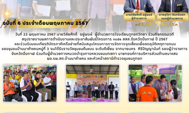 วันที่ 23 พฤษภาคม 2567 นายวิลัยศักดิ์ อยู่พงษ์ ผู้อำนวยการโรงเรียนภูทอกวิทยา ร่วมกิจกรรมเวทีสรุปรายงานผลการดำเนินงานและประชาสัมพันธ์โครงการ node สสส.จังหวัดบึงกาฬ ปี 2567 และร่วมรับมอบเกียรติบัตรภาคีเครือข่ายที่สนับสนุนโครงการการจัดการจุดเสี่ยงเพื่อลดอุบัติเหตุทางถนนของชุมชนบ้านนาคำแคนหมู่ที่ 3 จนได้รับรางวัลชุมชนต้นแบบ ระดับดีเยี่ยม จาก นายนคร ศิริปัญญานันท์ รองผู้ว่าราชการจังหวัดบึงกาฬ ร่วมกับผู้อำนวยการหมวดบำรุงทางหลวงชนบทเซกา นายกองค์การบริหารส่วนตำบลนาแสง ผอ.รพ.สต.บ้านนาคำแคน และหัวหน้าสถานีตำรวจชุมชนภูทอก
