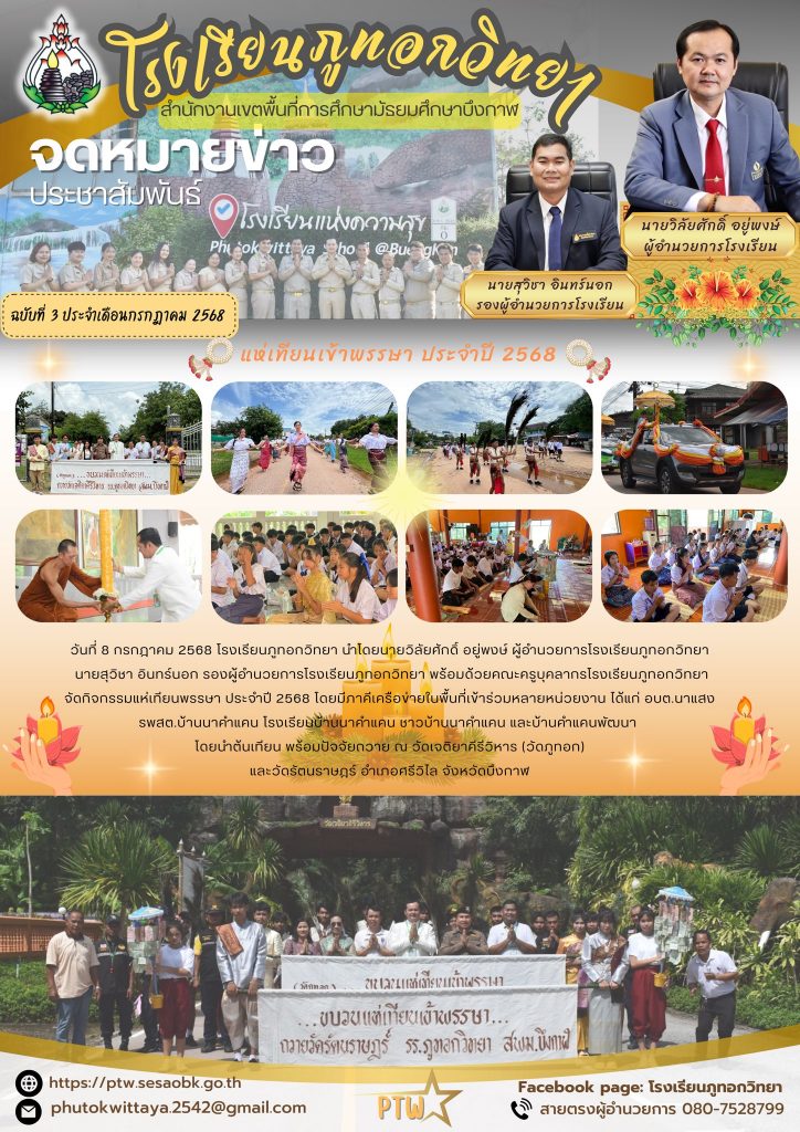 วันที่ 8 กรกฎาคม 2568 โรงเรียนภูทอกวิทยา นำโดยนายวิลัยศักดิ์ อยู่พงษ์ ผู้อำนวยการโรงเรียนภูทอกวิทยา นายสุวิชา อินทร์นอก รองผู้อำนวยการโรงเรียนภูทอกวิทยา พร้อมด้วยคณะครูบุคลากรโรงเรียนภูทอกวิทยา จัดกิจกรรมแห่เทียนพรรษา ประจำปี 2568 โดยมีภาคีเครือข่ายในพื้นที่เข้าร่วมหลายหน่วยงาน ได้แก่ อบต.นาแสงรพสต.บ้านนาคำแคน โรงเรียนบ้านนาคำแคน ชาวบ้านนาคำแคน และบ้านคำแคนพัฒนา โดยนำต้นเทียน พร้อมปัจจัยถวาย ณ วัดเจติยาคีรีวิหาร (วัดภูทอก) และวัดรัตนราษฎร์ อำเภอศรีวิไล จังหวัดบึงกาฬ
