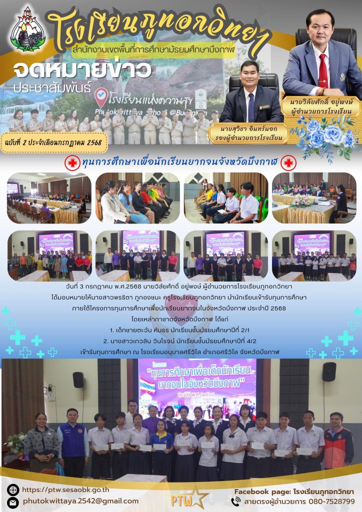 วันที่ 3 กรกฎาคม พ.ศ.2568 นายวิลัยศักดิ์ อยู่พงษ์ ผู้อำนวยการโรงเรียนภูทอกวิทยา ได้มอบหมายให้นางสาวพรธิตา ภูกองชนะ ครูโรงเรียนภูทอกวิทยา นำนักเรียนเข้ารับทุนการศึกษา ภายใต้โครงการทุนการศึกษาเพื่อนักเรียนยากจนในจังหวัดบึงกาฬ ประจำปี 2568 โดยเหล่ากาชาดจังหวัดบึงกาฬ