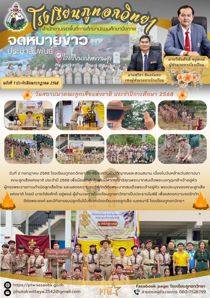 วันที่ 2 กรกฎาคม 2568 โรงเรียนภูทอกวิทยา จัดพิธีทบทวนคำปฏิญาณและสวนสนาม เนื่องในวันคล้ายวันสถาปนาคณะลูกเสือแห่งชาติ ประจำปี 2568 เพื่อน้อมรำลึกในพระมหากรุณาธิคุณพระบาทสมเด็จพระมงกุฎเกล้าเจ้าอยู่หัว ผู้ทรงพระราชทานกำเนิดลูกเสือไทย และแสดงความจงรักภักดีต่อพระบาทสมเด็จพระเจ้าอยู่หัว พระประมุขของคณะลูกเสือแห่งชาติ โดยมี นายวิลัยศักดิ์ อยู่พงษ์ ผู้อำนวยการโรงเรียนภูทอกวิทยา เป็นประธานในพิธี และมีกิจกรรมปลูกต้นไม้บริเวณโรงเรียนของลูกเสือ-เนตรนารี ณ โรงเรียนภูทอกวิทยา