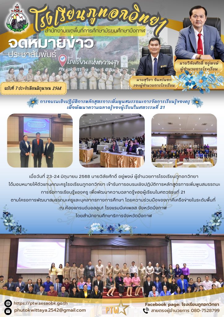 เมื่อวันที่ 23-24 มิถุนายน 2568 นายวิลัยศักดิ์ อยู่พงษ์ ผู้อำนวยการโรงเรียนภูทอกวิทยา ได้มอบหมายให้ตัวแทนคณะครูโรงเรียนภูทอกวิทยา เข้ารับการอบรมเชิงปฏิบัติการหลักสูตรการเพิ่มพูนสมรรถนะ การจัดการเรียนรู้ของครู เพื่อพัฒนาความฉลาดรู้ของผู้เรียน ในศตวรรษที่ 21 ตามโครงการพัฒนาสมรรถนะครูและบุคลากรทางการศึกษา โดยความร่วมมือของภาคีเครือข่ายในระดับพื้นที่ ณ ห้องแกรนด์บอลลูน1 โรงแรมบีเคเพลส จังหวัดบึงกาฬ โดยสำนักงานศึกษาธิการจังหวัดบึงกาฬ
