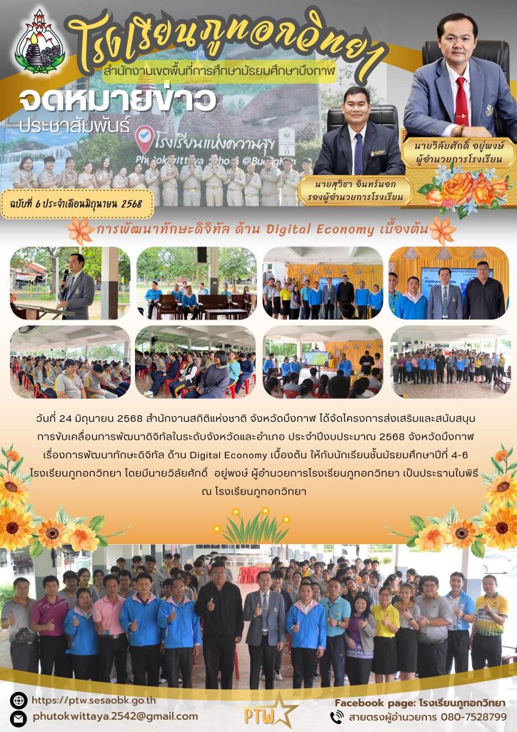 วันที่ 24 มิถุนายน 2568 สำนักงานสถิติแห่งชาติ จังหวัดบึงกาฬ ได้จัดโครงการส่งเสริมและสนับสนุนการขับเคลื่อนการพัฒนาดิจิทัลในระดับจังหวัดและอำเภอ ประจำปีงบประมาณ 2568 จังหวัดบึงกาฬ เรื่องการพัฒนาทักษะดิจิทัล ด้าน Digital Economy เบื้องต้น ให้กับนักเรียนชั้นมัธยมศึกษาปีที่ 4-6 โรงเรียนภูทอกวิทยา โดยมีนายวิลัยศักดิ์ อยู่พงษ์ ผู้อำนวยการโรงเรียนภูทอกวิทยา เป็นประธานในพิธี ณ โรงเรียนภูทอกวิทยา