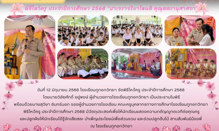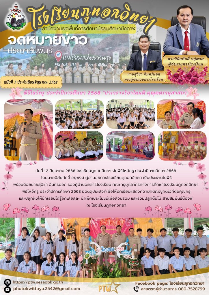 วันที่ 12 มิถุนายน 2568 โรงเรียนภูทอกวิทยา จัดพิธีไหว้ครู ประจำปีการศึกษา 2568 โดยนายวิลัยศักดิ์ อยู่พงษ์ ผู้อำนวยการโรงเรียนภูทอกวิทยา เป็นประธานในพิธีทพร้อมด้วยนายสุวิชา อินทร์นอก รองผู้อำนวยการโรงเรียน คณะครูบุคลากรทางการศึกษาโรงเรียนภูทอกวิทยา พิธีไหว้ครู ประจำปีการศึกษา 2568 มีวัตถุประสงค์เพื่อให้นักเรียนแสดงความกตัญญูกตเวทีต่อคุณครู และปลูกฝังให้นักเรียนได้รู้จักเสียสละ บำเพ็ญประโยชน์ เพื่อส่วนรวม และร่วมกันปลูกต้นไม้ สานสัมพันธ์น้องพี่ ณ โรงเรียนภูทอกวิทยา