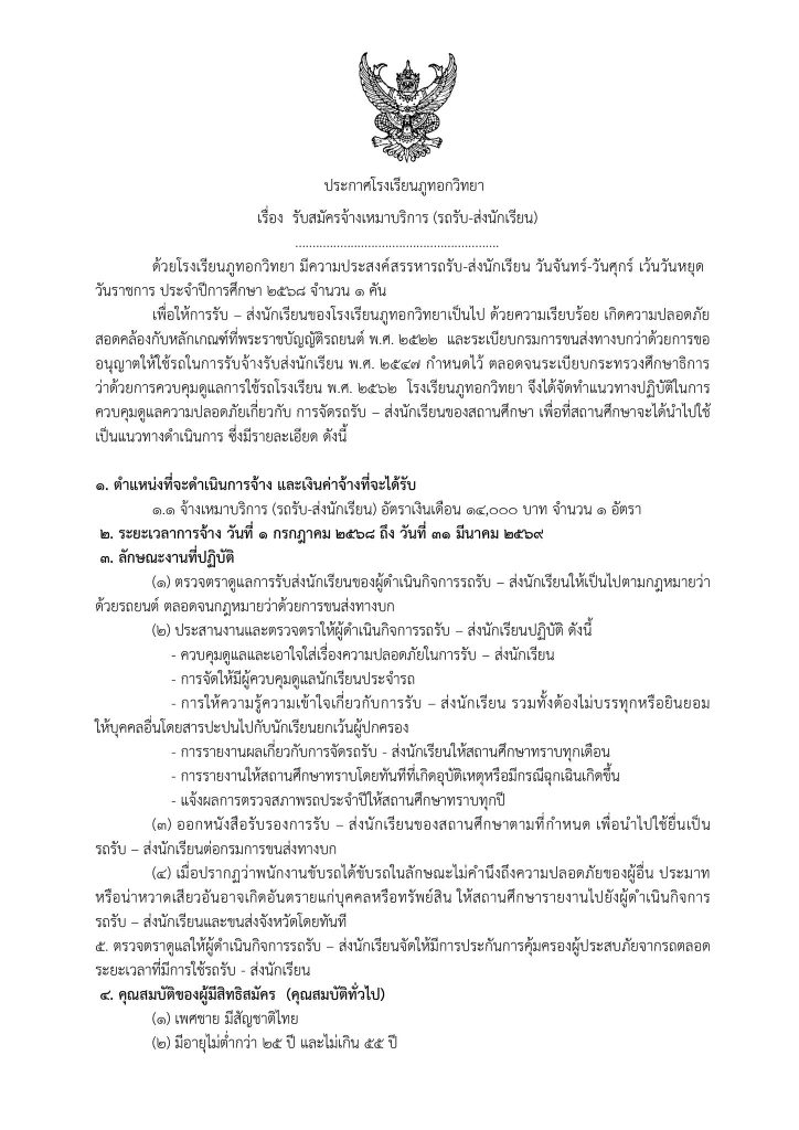 ประกาศโรงเรียนภูทอกวิทยา เรื่อง รับสมัครจ้างเหมาบริการ (รถรับ-ส่งนักเรียน) ประจำปีการศึกษา 2568